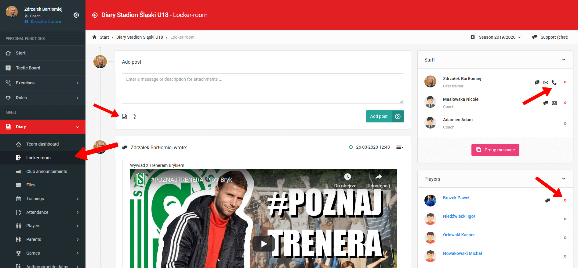 Die Umkleidekabine und das Brett funktionieren als geschlossene Benutzergruppe, in der Sie Dateien, Videos, Fotos oder Links teilen können. Darüber hinaus können Sie hier eine Gruppenkonversation mit ausgewählten Benutzern sowie ein privates Gespräch mit einem bestimmten Trainer initiieren. Die Umkleidekabine und das Brett sind auch über die mobile Anwendung verfügbar, und jeder Beitrag, den Sie hinzufügen, generiert eine Push-Benachrichtigung für die vorgesehenen Benutzer.