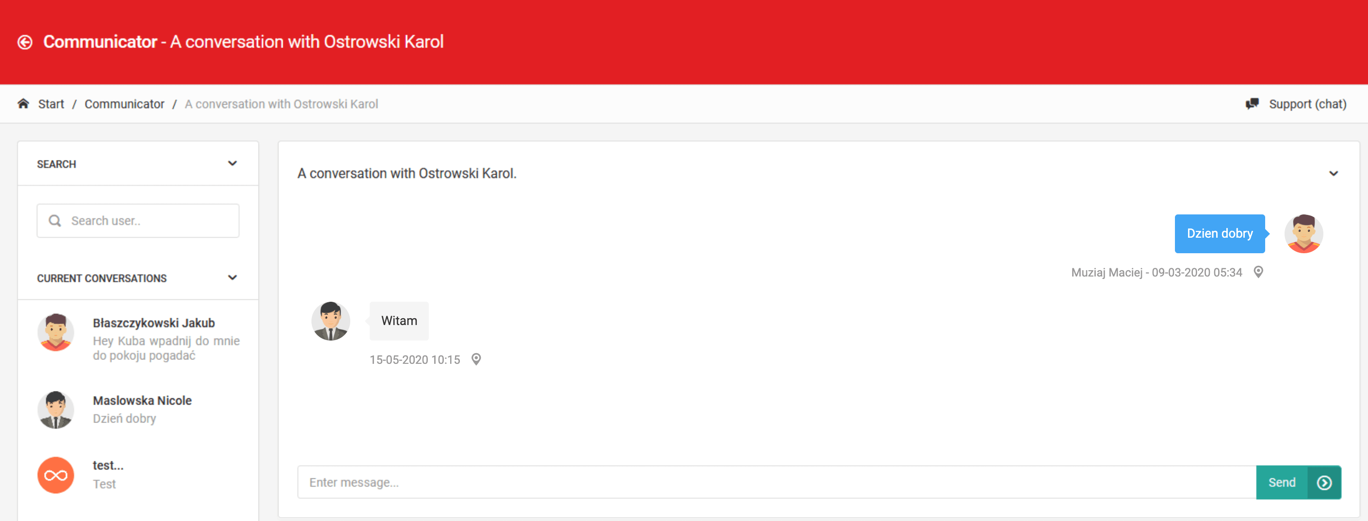 Sowohl über die mobile Anwendung als auch über den Webbrowser steht ein Messenger zur Verfügung, der die Kommunikation zwischen den Systembenutzern ermöglicht. Es stehen zwei Gesprächsmodi zur Verfügung - privat (1 zu 1) und Gruppenkonversation, an der mehrere Benutzer teilnehmen können.