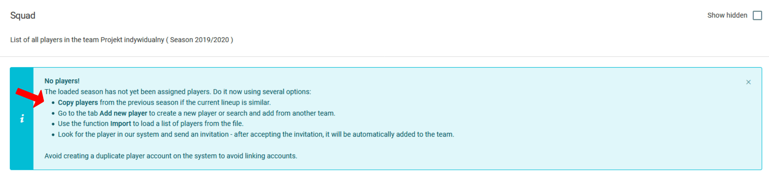 Nach dem Erstellen der nächsten Saison in Ihrem Team werden Sie beim Aufrufen des Reiters Tagebuch Spieler Kader das Fehlen einer Spielerliste bemerken. Diese Situation ist beabsichtigt und völlig normal. Dank der Funktion "Spieler aus der vorherigen Saison kopieren" werden Sie in der neuen Saison nur Spieler haben, die tatsächlich in der neuen Saison in Ihrem Team geblieben sind.