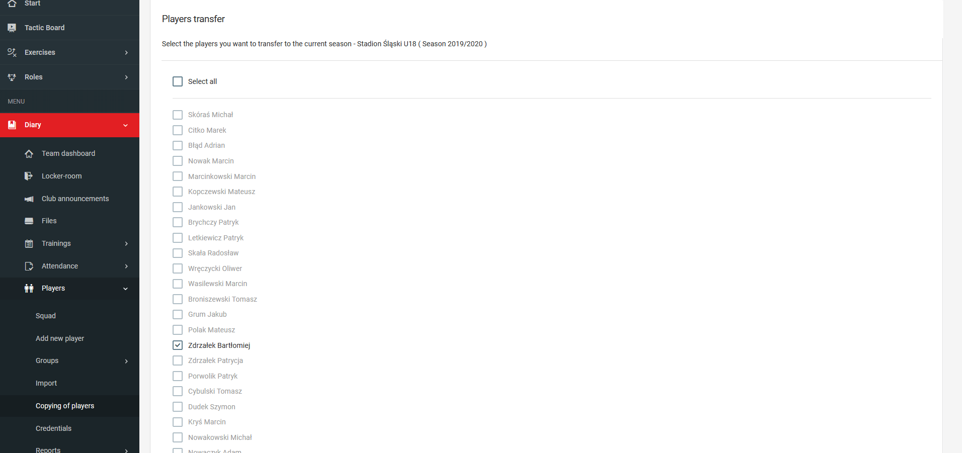 Um mit dem Kopieren von Spielern aus der vorherigen Saison zu beginnen, klicken Sie bitte auf den fettgedruckten Text "Spieler kopieren", wie im obigen Bild gezeigt, oder klicken Sie im linken Menü auf Tagebuch Spieler Spieler kopieren.