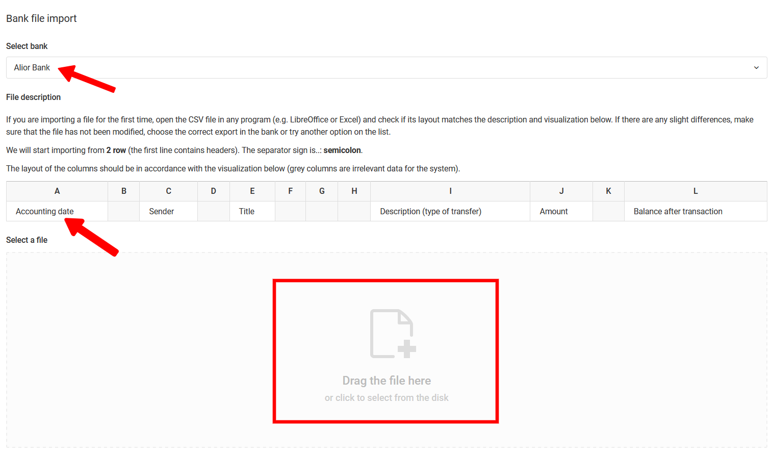 Εάν έχετε το σωστό αρχείο και εάν το εισαγάγετε για πρώτη φορά, ανοίξτε το αρχείο σε οποιοδήποτε πρόγραμμα (π.χ. LibreOffice ή Excel) και ελέγξτε εάν η διάταξή του ταιριάζει με την περιγραφή του αρχείου και την οπτικοποίησή του. Εάν υπάρχουν μικρές διαφορές, βεβαιωθείτε ότι το αρχείο δεν έχει τροποποιηθεί, επιλέξτε τη σωστή εξαγωγή στο διαδικτυακό τραπεζικό σύστημα ή δοκιμάστε μια άλλη επιλογή από τη λίστα τραπεζών (για ορισμένες τράπεζες έχουμε περισσότερους από έναν αναλυτές). Να θυμάστε ότι δεν χρειάζεται να καταργήσετε τις εξερχόμενες μεταφορές, το σύστημα θα τις αναγνωρίσει και θα τις αγνοήσει κατά τη διαδικασία ανάλυσης αρχείων. Εάν η περιγραφή και η δομή του αρχείου σας ταιριάζουν με αυτήν που εμφανίζεται στο παράθυρο εισαγωγής, δεν θα έχετε άλλη επιλογή από το να σύρετε το αρχείο στο πεδίο που φέρει ένα κόκκινο πλαίσιο. Εάν το αρχείο είναι σωστό, το σύστημα θα αρχίσει την ανάλυση του αρχείου, το οποίο θα σας μεταφέρει στη λίστα συναλλαγών που δημιουργήθηκε.