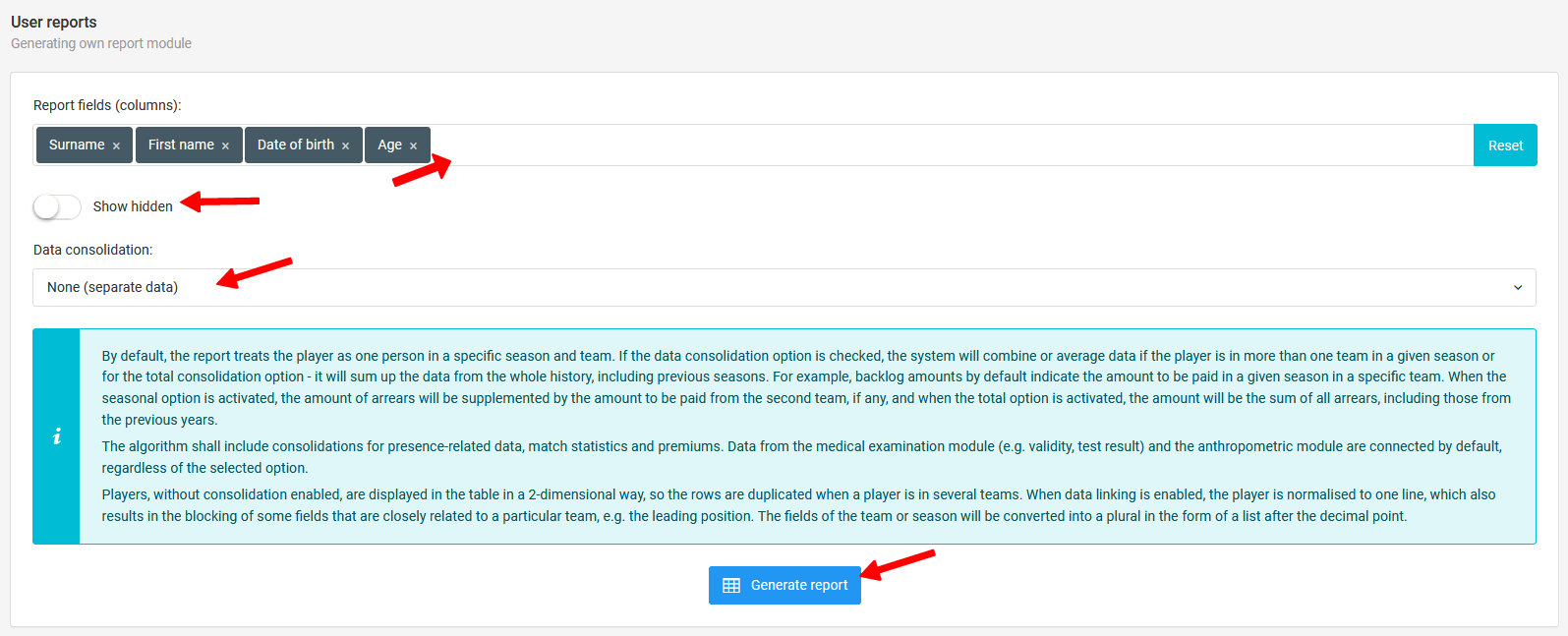 Για να προετοιμάσετε τη δική σας αναφορά, εισαγάγετε τα δεδομένα που θέλετε να προσθέσετε στο πεδίο αναφοράς (στήλη). Όταν τελειώσετε με την προσθήκη στηλών στην αναφορά, μπορείτε να καθορίσετε δύο επιπλέον λεπτομέρειες. Το πρώτο είναι εάν η αναφορά πρέπει να περιλαμβάνει κρυμμένους παίκτες και το δεύτερο είναι η ενοποίηση δεδομένων. Εδώ αποφασίζετε εάν τα δεδομένα ενός παίκτη θα πρέπει να συλλέγονται μόνο για μία σεζόν, για μία ομάδα ή για όλα τα δεδομένα που αφορούν αυτόν τον παίκτη.