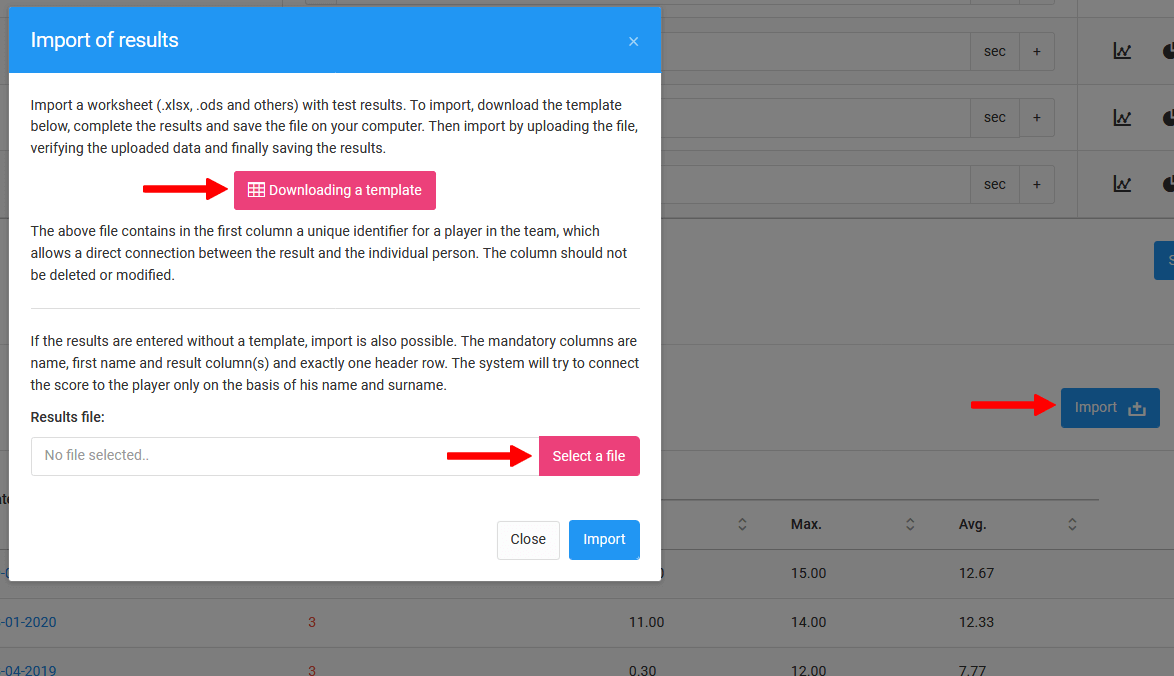 Το σύστημα σάς επιτρέπει να φορτώνετε τα αποτελέσματα των δοκιμών (τεστ) από ένα αρχείο xls που είχε προετοιμαστεί προηγουμένως. Για να το κάνετε αυτό, κάντε κλικ στο μπλε εικονίδιο "εισαγωγή" στο παράθυρο εισαγωγής αποτελεσμάτων δοκιμής (τεστ). Το κλικ θα εμφανίσει ένα παράθυρο, όπου μπορείτε να κατεβάσετε το πρότυπο αρχείου ή να φορτώσετε το ήδη ολοκληρωμένο αρχείο xls. Για να βεβαιωθείτε ότι τα δεδομένα θα διαβαστούν καλά και θα αντιστοιχιστούν στα αντίστοιχους παίκτες, σας συνιστούμε να χρησιμοποιήσετε ένα αρχείο προτύπου xls.