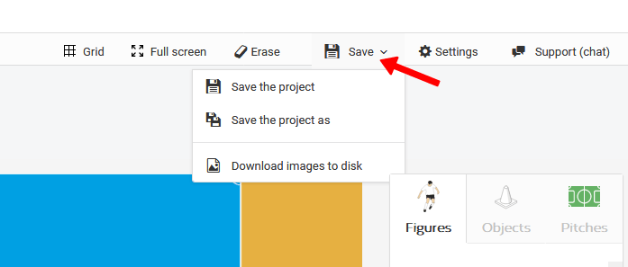 The system gives you three saving options. To select one of them, click the "save" button in the upper function menu. The created graphic drawing can be saved as a project, a variation of the currently opened project or as a png file on your computer. The saved projects will appear in your private exercise library.