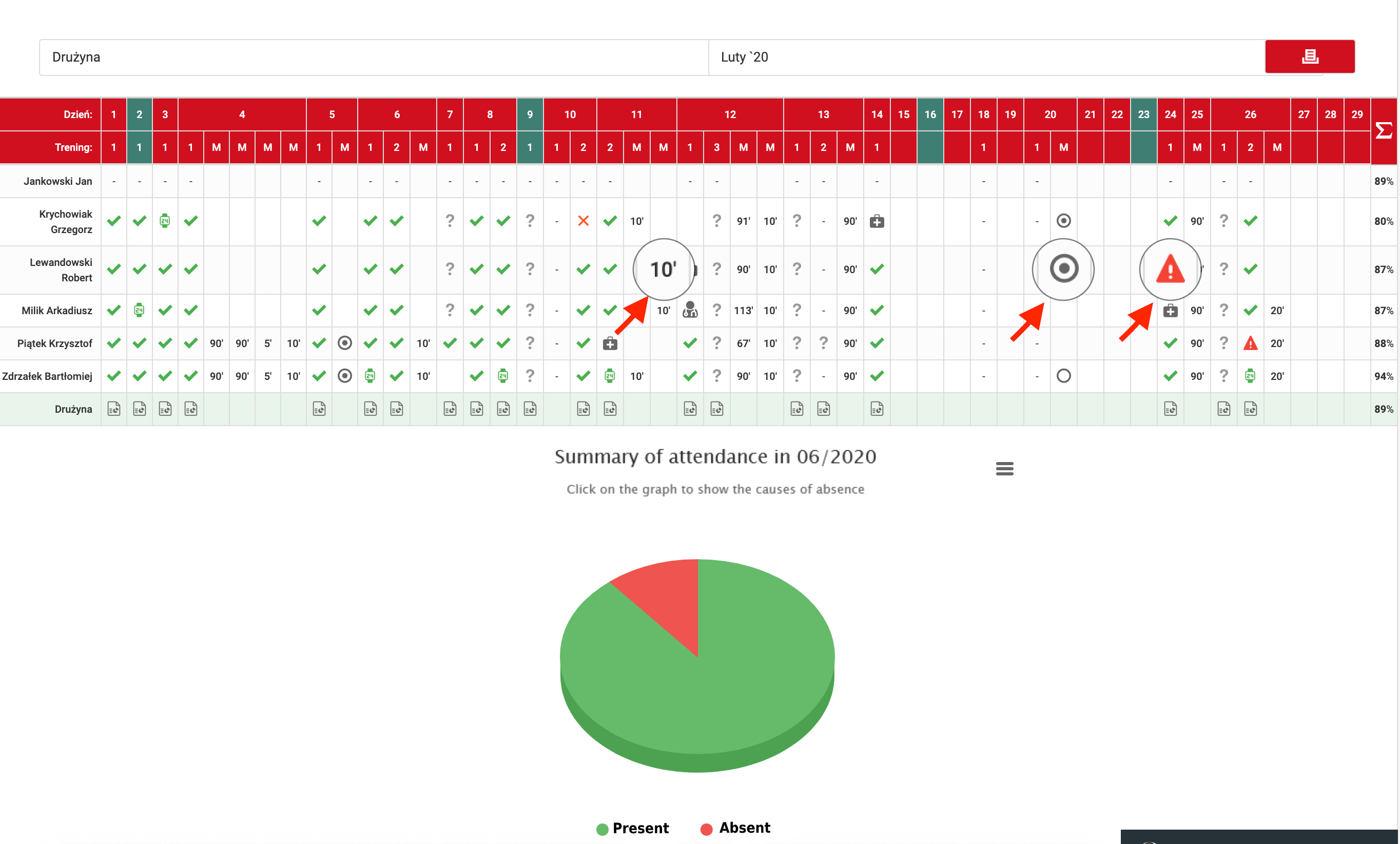 Debajo de la tabla hay un gráfico circular que muestra la asistencia para el rango de datos seleccionado, en el mes elegido. Vale la pena señalar que este gráfico es interactivo. Cuando haces clic en el área roja, el gráfico mostrará datos detallados sobre los motivos de las ausencias en las sesiones de entrenamiento.