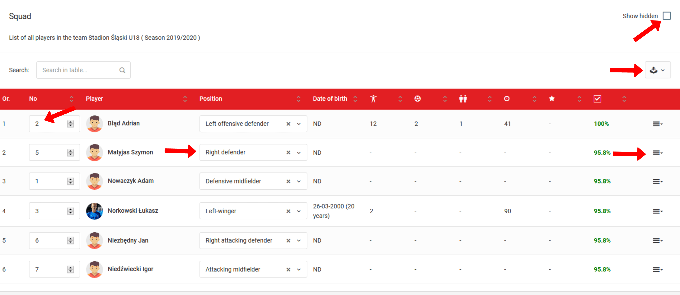 Ovdje također imate mogućnost postaviti broj na dresu igrača (prvi stupac), rasporediti igrača u trening podskupinu (drugi stupac), kao i postaviti njegovu zadanu poziciju na terenu. U zadnjem stupcu pronaći ćete ikonu koja otvara izbornik funkcija za odabranog igrača. Ne zaboravite spremiti svaku promjenu klikom na gumb "Spremi".