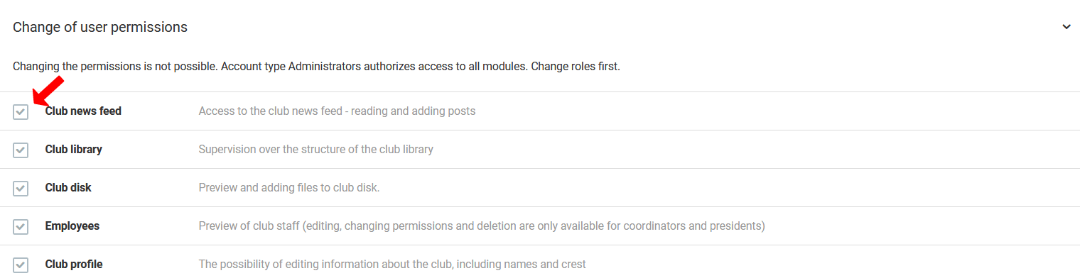 უფლებამოსილებებზე დაწკაპუნების შემდეგ, გადახვალთ გვერდზე, სადაც შეგიძლიათ ნახოთ ყველა შესაძლო მართვის მოდული. შემდეგი მოსანიშნი უჯრების მონიშვნით მისცემთ მომხმარებელს უფლებამოსილებებს მოდულებზე. გთხოვთ, გაითვალისწინოთ, რომ ზოგიერთი მოდული კრიტიკულად მნიშვნელოვანია სისტემისა და მასში შემავალი მონაცემებისთვის, ამიტომ კარგად დაფიქრდით, ვის აძლევთ წვდომას საკვანძო მოდულებზე. სისტემაში გარკვეული ელემენტების წაშლა შეუქცევადია!