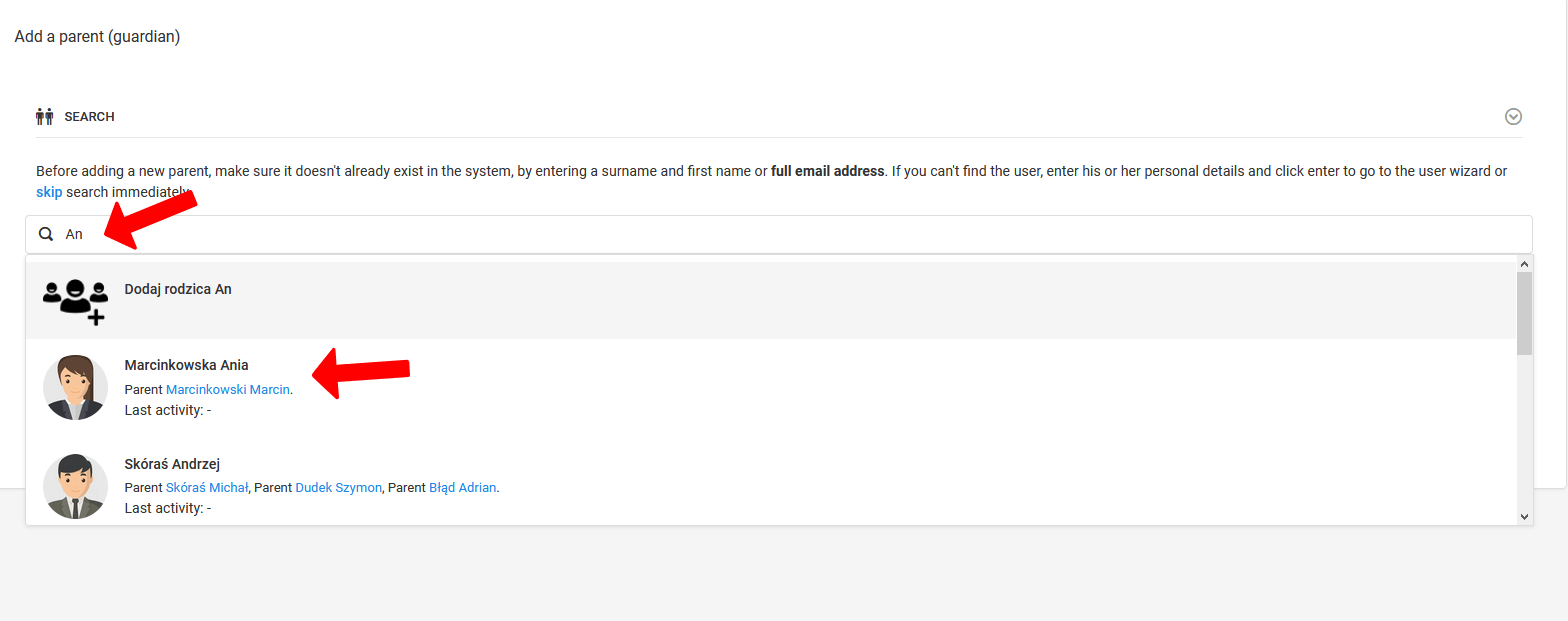 თუ მშობელი ჯერ არ არის სისტემაში, საძიებო სისტემის ქვემოთ არსებული ველები უნდა შეივსოს ხელით. აქ გადაწყვეტთ, გსურთ თუ არა მშობლისთვის შესვლის სახელისა და პაროლის მიცემა. ამისათვის მონიშნეთ ნაცრისფერი მოსანიშნი უჯრა. თუ შეიყვანთ მშობლის ელ-ფოსტის მისამართს და მონიშნავთ წვდომას, ამ ელ-ფოსტის მისამართზე გაიგზავნება წერილი შესვლის მონაცემებით.