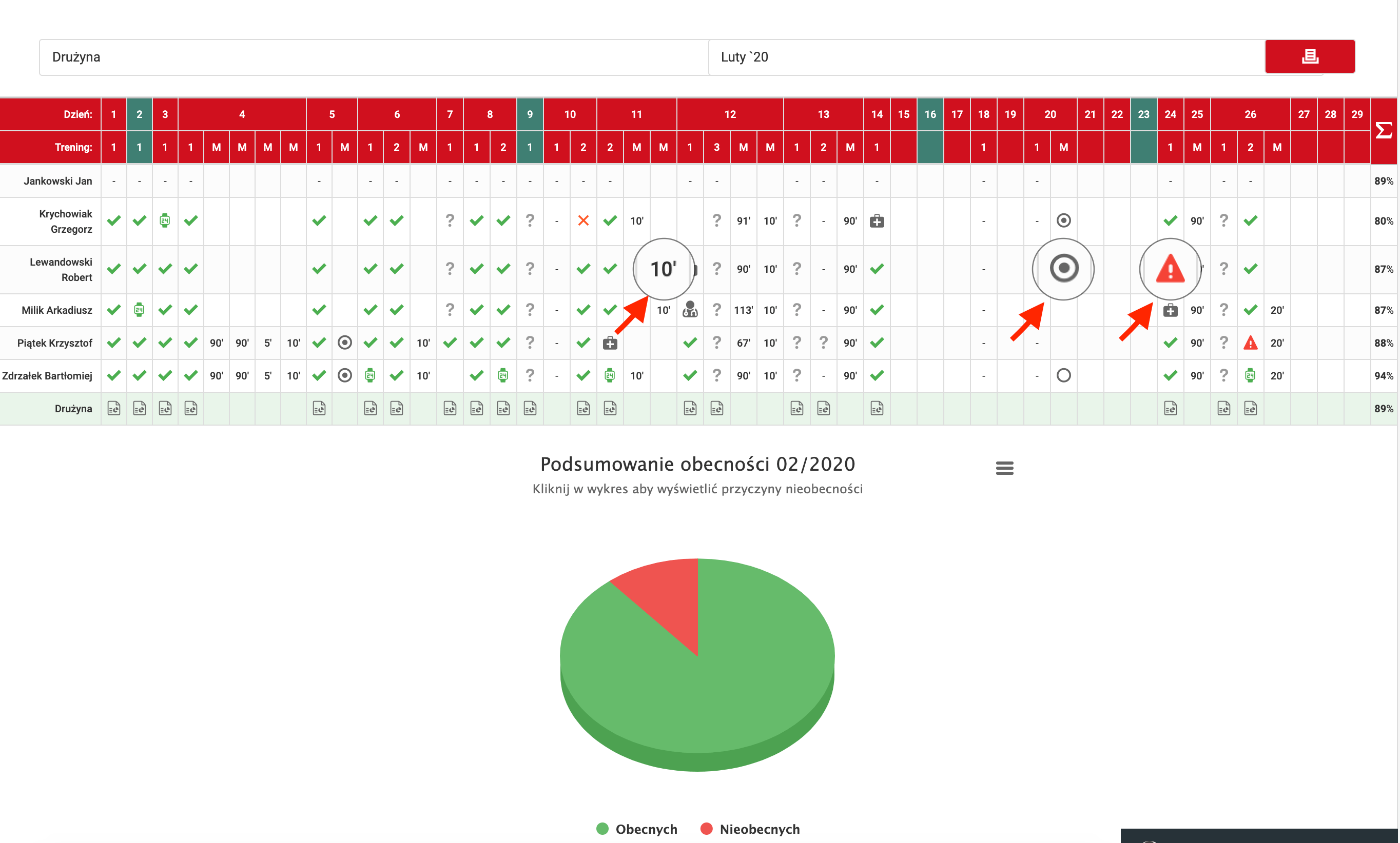Tabela zbiorczo przedstawia dane dotyczące treningów i meczów. Ikonki symbolizują obecność zawodnika na treningu lub powód jego nieobecności. Symbole dotyczące meczów (kółko puste lub kółko pełne) oznaczają powołanie do pierwszego składu lub na ławkę rezerwowych. Jeżeli uzupełnisz statystyki meczowe, zawodnikowi w tabelce pojawi się rozegrany przez niego na boisku czas. W górnej części strony masz pola wyboru pozwalające Ci zmieniać wyświetlane miesiące jak i również zawężanie statystyk przedstawionych w tabelce do jednego, wybranego zawodnika. W ostatniej kolumnie i w ostatnim wierszu tabeli znajdują się podsumowania frekwencji zawodnika w miesiącu oraz drużyny na danym treningu.