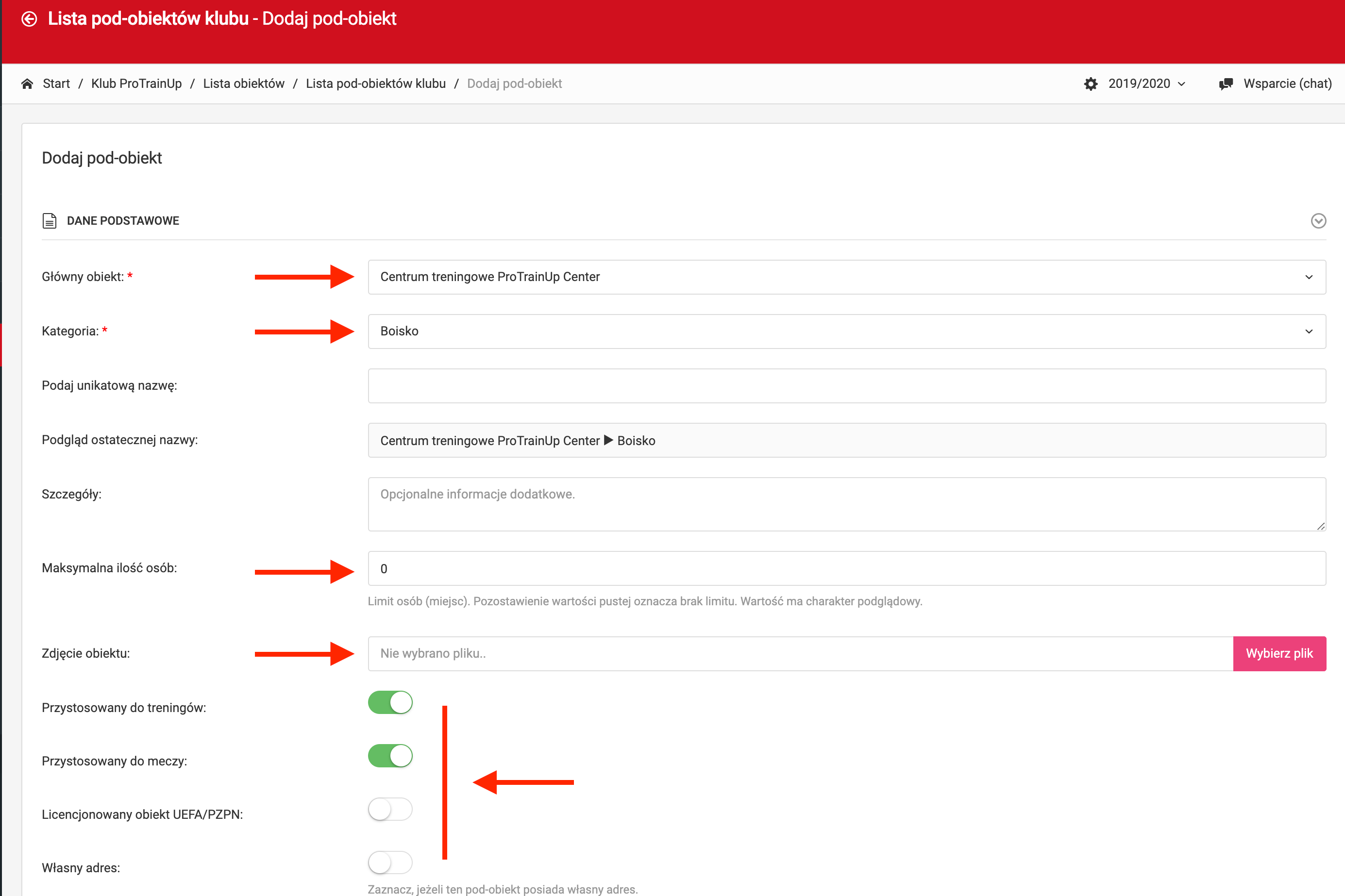 Po kliknięciu dodaj, przeniesiony zostaniesz do formularza dodawania pod-obiektu, w którym do uzupełniania będziesz miał kilka istotnych pól. Pierwszymi elementami jest ustalenie obiektu nadrzędnego oraz kategorii pod-obiektu. Do wyboru masz m.in: boisko, basen, hala, szatnia czy też siłownia. Typ lokalizacji determinuje prefiks nazwy tak więc np. w przypadku sal wpisujemy w nazwę wyłącznie sam numer. Mechanizm ułatwia dodawanie prostych obiektów np. "Orlik przy szkole nr 7", z jednym pod-obiektem - "Boisko" bez konieczności wymyślania nazwy dla boiska. Interaktywny podgląd pod polem nazwy pozwala zrozumieć konwencje. W kolejnych etapach uzupełnij opis pod obiektu, określ maksymalną ilość osób na pod-obiekcie, dodaj zdjęcie, a także inne parametry dodawanego pod-obiektu. Jeżeli ma on indywidualny adres, może go także dodać.