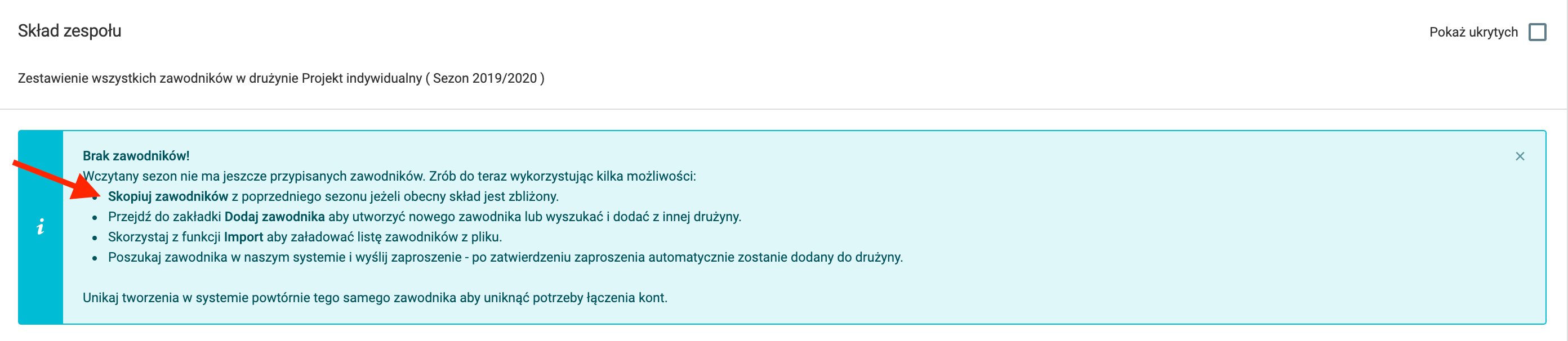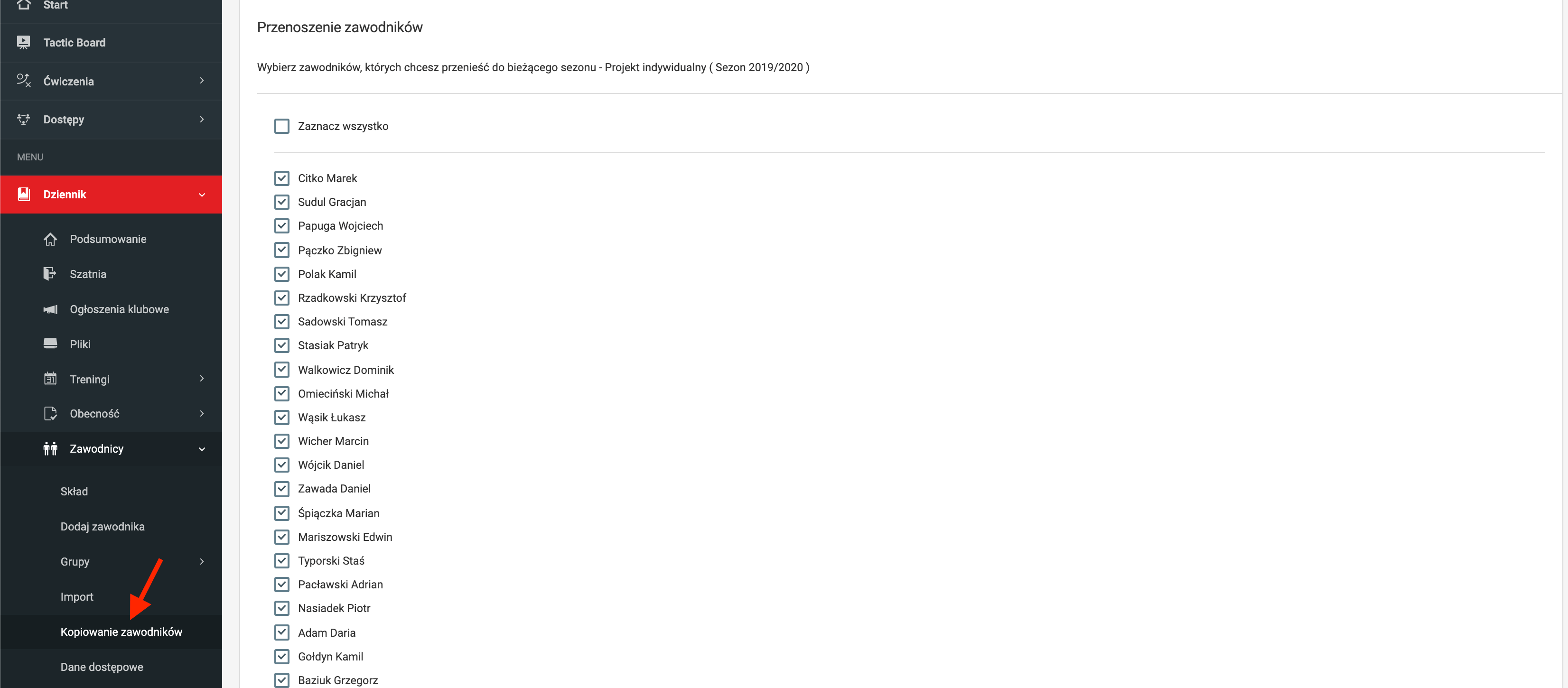 Aby wejść w kopiowanie zawodników z poprzedniego sezonu, możesz kliknąć w pogrubiony tekst "skopuj zawodników" tak jak na obrazku powyżej lub kliknąć w lewym menu w dziennik zawodnicy kopiuj zawodników.