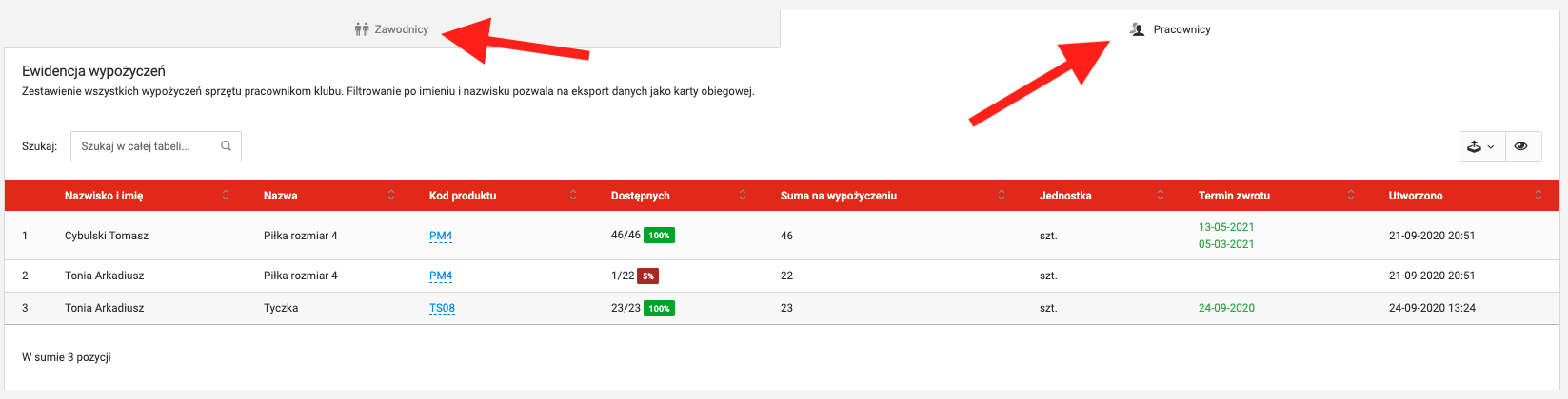 Moduł ten zezwala Ci na szybkie ewidencjonowania kwestii co i komu zostało wypożyczone. Aby wejść w zestawienie wypożyczeń, z lewego menu wybierz zakładkę klub sprzęt i magazyny sprzęt i produkty ewidencja wypożyczeń. Ponadto dowiesz się w jakiej ilości zostało to wypożyczone i do kiedy dany sprzęt ma zostać zwrócony do magazynu. W widoku zestawienia wypożyczeń możesz podglądnąć zarówno transfery dotyczące zawodników jak i trenerów.