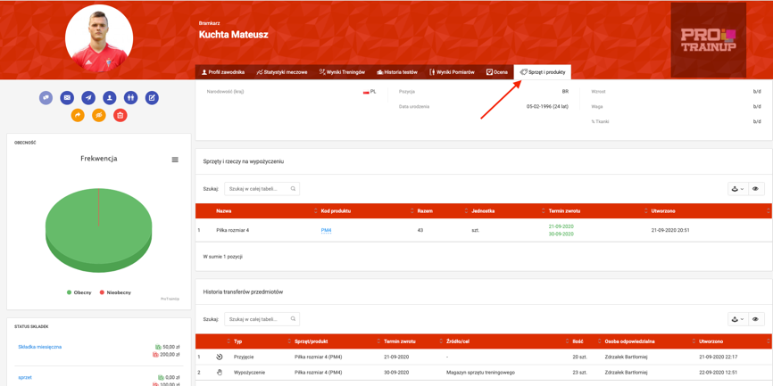 Zestawienie dotyczące wydanego sprzętu danemu zawodnikowi, znajdziesz także w ich profilach. Aby wejść do profilu zawodnika, kliknij w jego imię i nazwisko w zakładce z listą zawodników. Następnie w górnej belce zakładek kliknij w „sprzęt i produkty”.