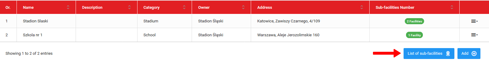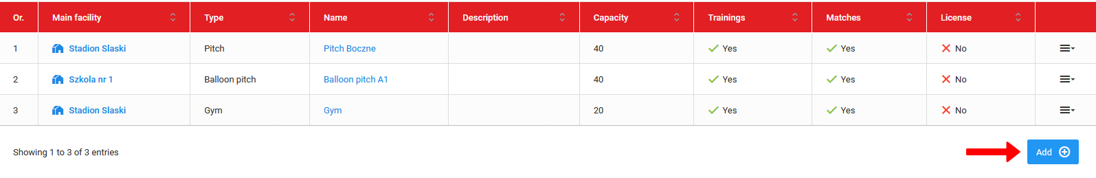 Da dodate podstavbo k stavbi staršev, pojdite na seznam podstavb in kliknite na modri gumb "dodaj". Dani stavbi lahko dodate kolikor podstavb želite. Zapomnite si, da boste lokacijo, ko boste dodajali trening ali tekmo, izbrali izmed podstavb.