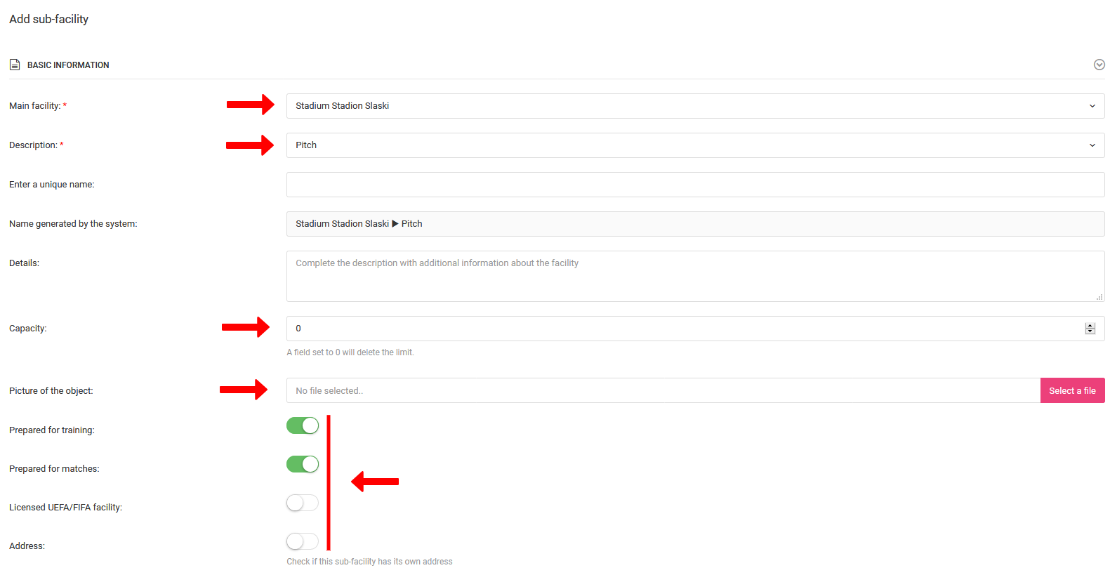 Po kliku za dodajanje se bo odprl obrazec za dodajanje podstavbe, kjer boste morali izpolniti več pomembnih polj. Prvi element je za določitev starševske stavbe in kategorije podstavbe. Izbirate lahko s seznama: igrišči, plavalni bazen, dvorana, slačilnica ali telovadnica. Na naslednjih straneh izpolnite ime in opis podstavbe, določite maksimalno število ljudi, dodajte sliko in druge parametre podstavbe. Če ima individualni naslov, ga lahko prav tako dodate.