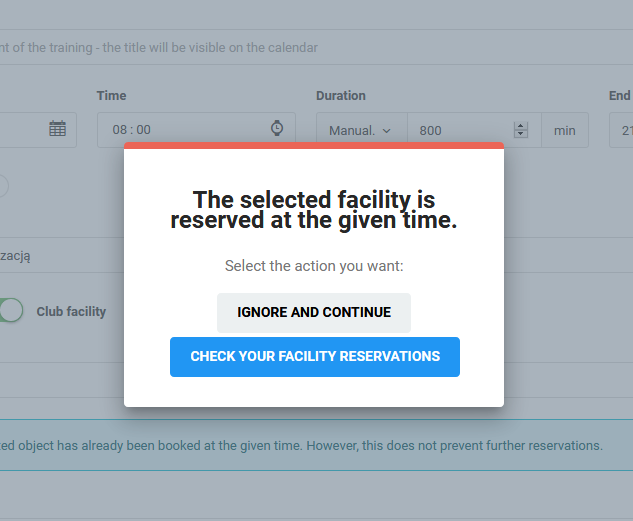 Okno, ki se bo prikazalo na ekranu, ko dodate trening ali tekmo, vam ponuja dve možnosti: ignoriranje in ustvarjanje dogodka z nasprotjem pogojev in drugo možnost: možnost preverjanja urnika rezervacij stavbe. Na ta način boste lahko preverili kdo je rezerviral stavbo na določen datum in naredili spremembe v urniku, če bo to potrebno.