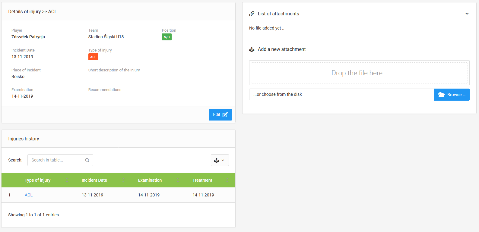 Vsaka vnesena poškodba ima svojo lastno zgodovino, kjer so shranjeni vsi podatki o poškodbi. Tukaj boste lahko dodali datoteko z npr. zdravstveno odpustnico ali x-ray kot priponko.